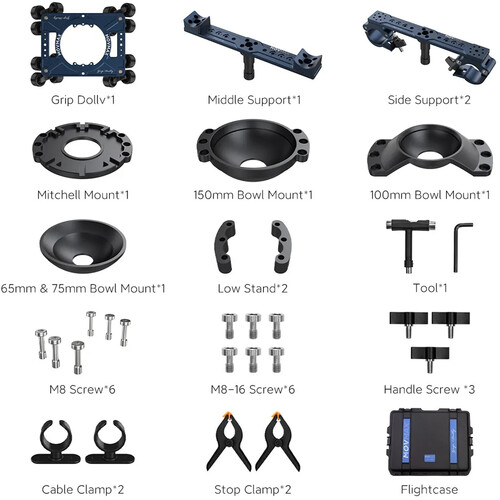1 x Mitchel Mount Plate for Slider 1 x Bowll Mount 100mm 2 x Slider Low Stand 1 x Grip Dolly 1 x Grip Dolly Middle Support 2 x Grip Dolly Side Support 1 x Grip Dolly Flightcase 2 x Grip Dolly Stop Clamps 1 x 65mm & 75mm Bowl Mount
